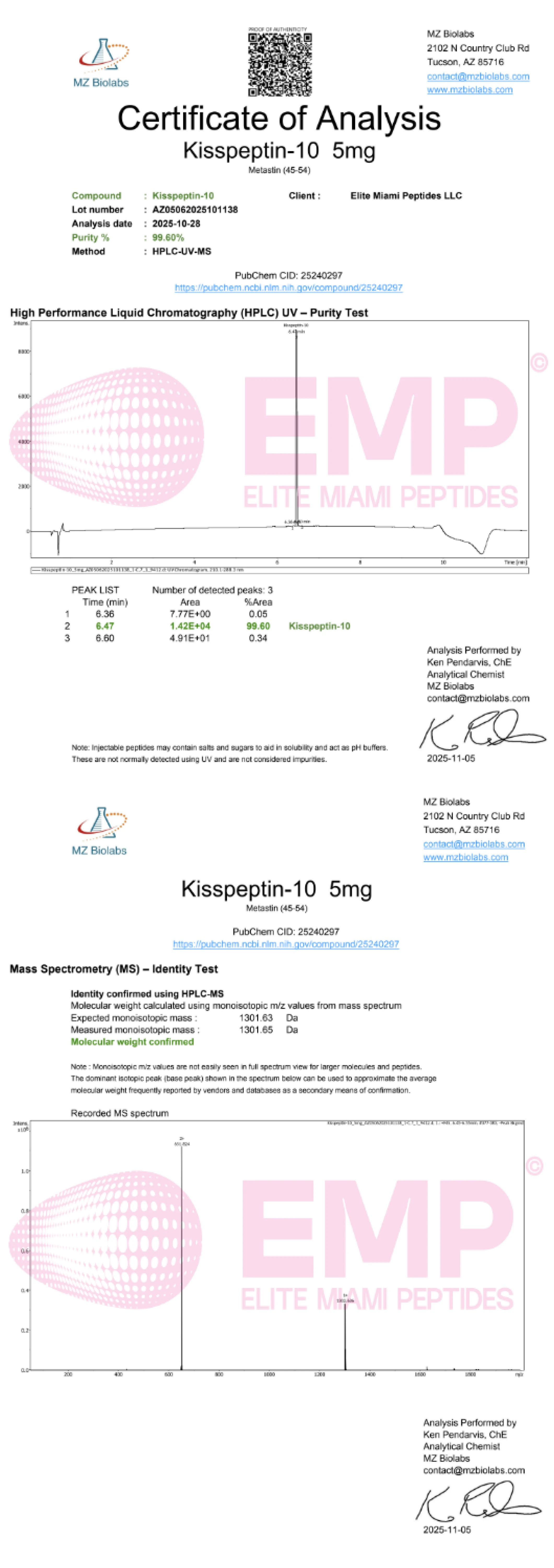 This research peptide is verified for 99 %+ purity. COA: Kisspeptin-10 (5mg / 60mg)
