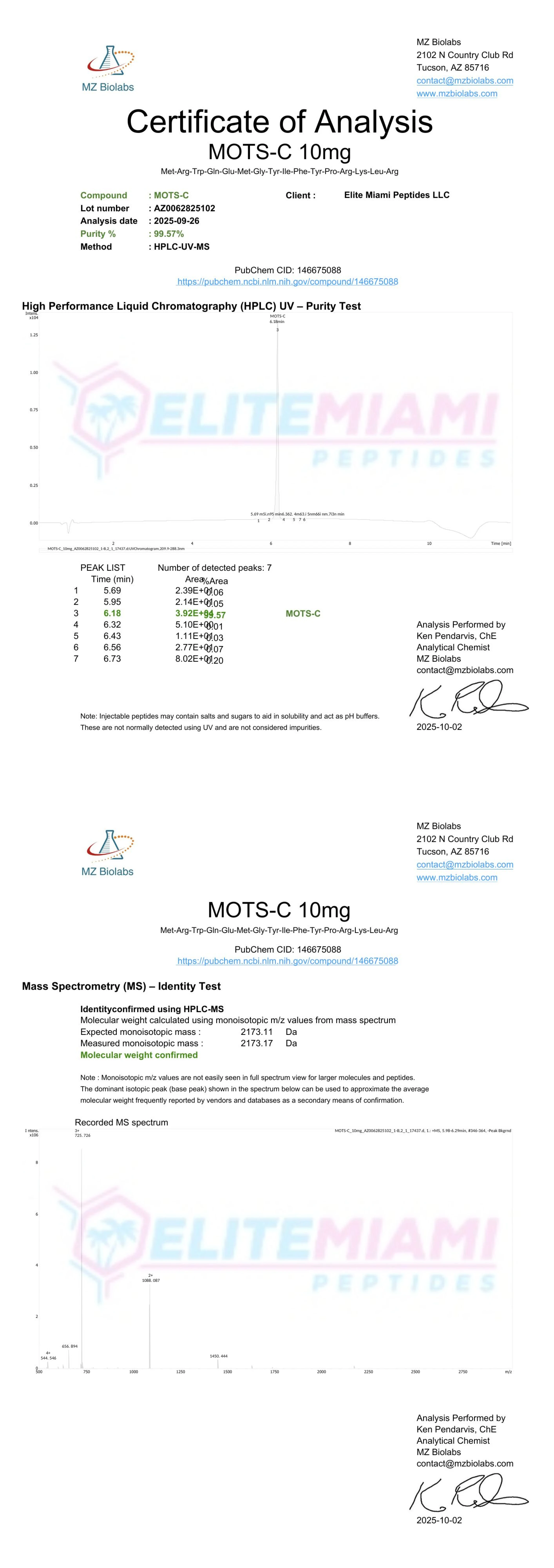MOTS-c has been evaluated across metabolic and cellular models, highlighting its potential involvement in: Metabolic regulation: glucose metabolism, insulin sensitivity, and energy balance. Mitochondrial activity: improving mitochondrial signaling and adaptive stress responses. Systemic balance: supporting recovery and resilience in metabolic studies. These results suggest that MOTS-c may serve as a model for studying how mitochondrial peptides influence energy regulation, cellular adaptation, and systemic balance in experimental biology.
