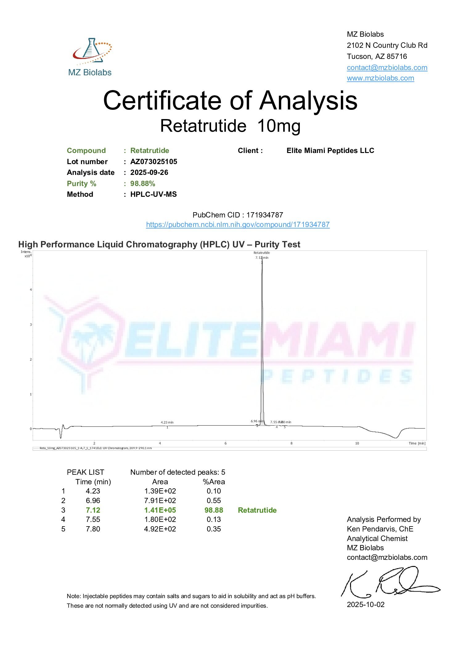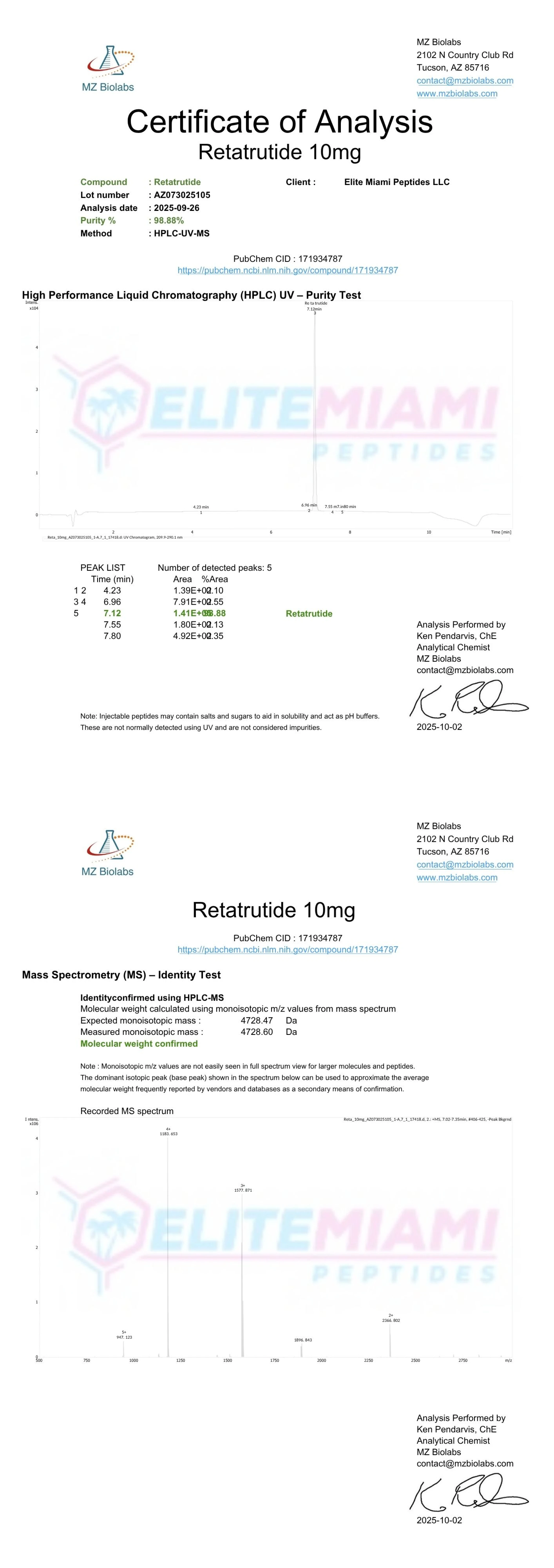 This research peptide is 99% purity. Certificate: EPS Retatrutide 10mg