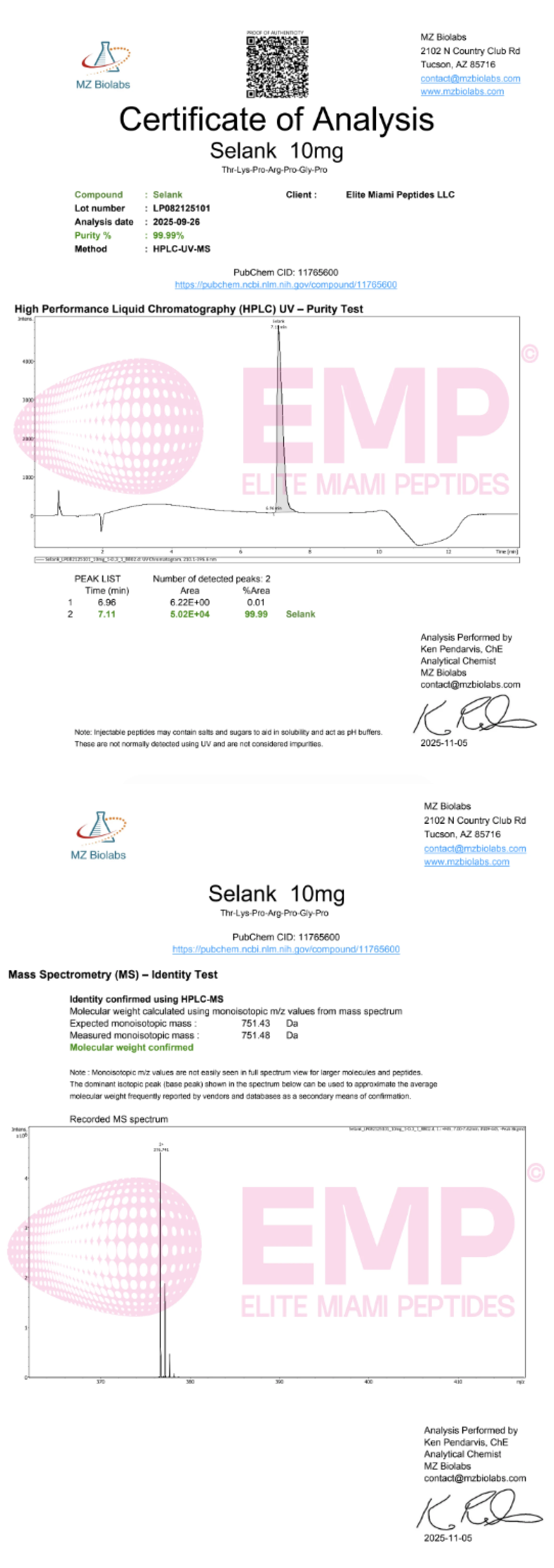 This research peptide is 99% purity. Certificate: EPS Selank (5mg / 10mg)