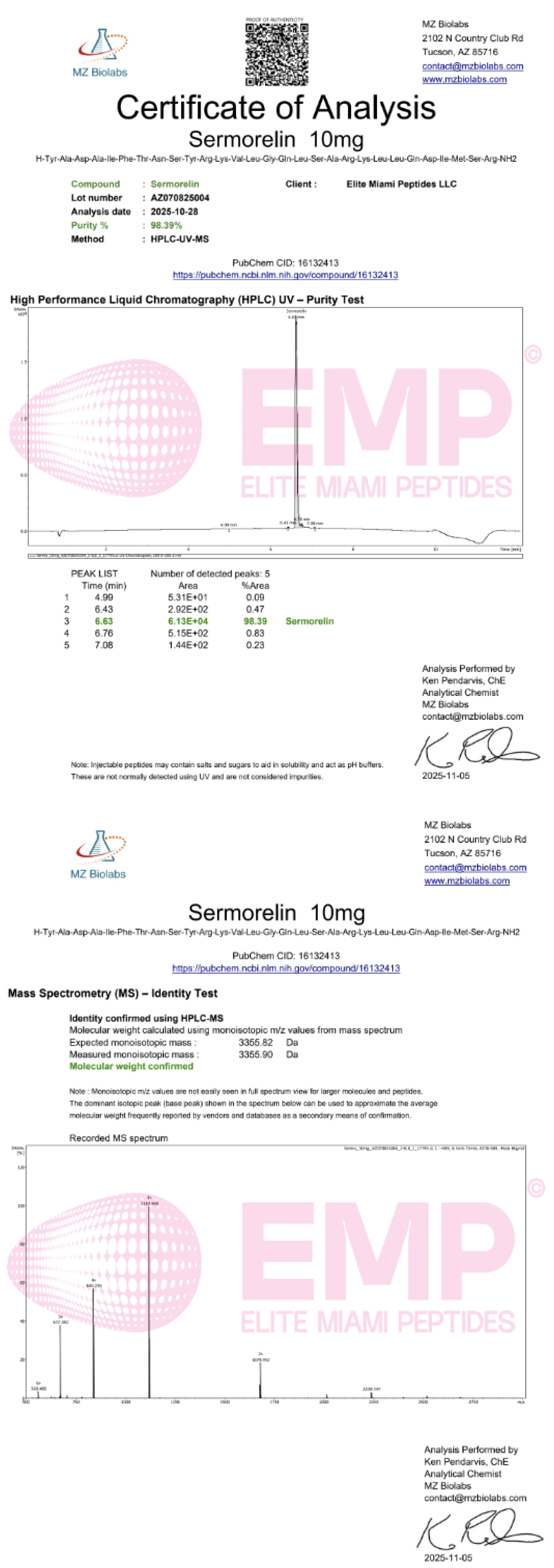 This research peptide is verified for 99%+ purity. COA: Sermorelin (5mg / 10mg)