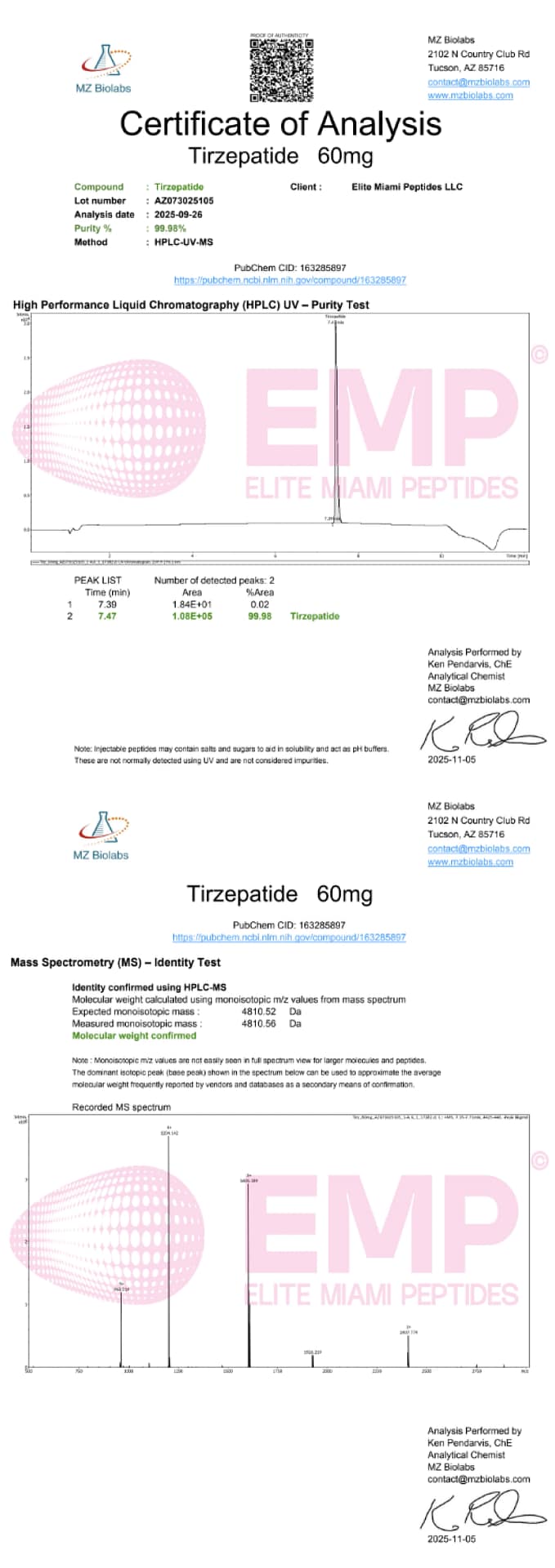 This research peptide is tested for 99%+ purity. COA: Tirzepatide (5mg / 60mg)